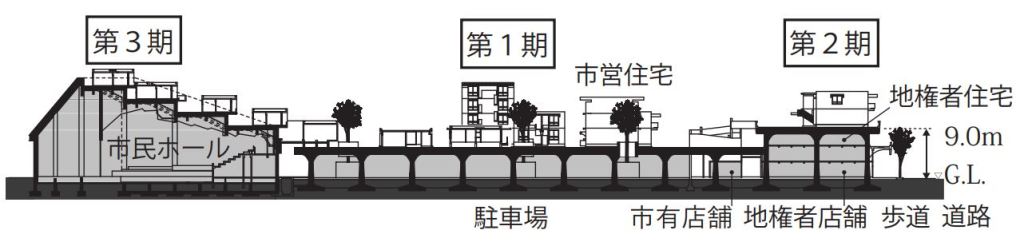 Sau 1965, nhà ở tập thể bắt đầu được xây dựng ồ ạt để đáp ứng cho một lượng lớn dân cư đổ về Tokyo để lao động, các khu đất bị phân chia nhỏ hơn do mật độ cư trú gia tăng làm giảm chất lượng môi trường sống. Một trong những giải pháp được đưa ra vào thời điểm đó là gia tăng thêm diện tích đất bằng cách làm các mặt sàn nhân tạo ở phía bên trên (人工地盤), hạn chế tối đa việc tác động vào mặt bằng tự nhiên ở bên dưới.