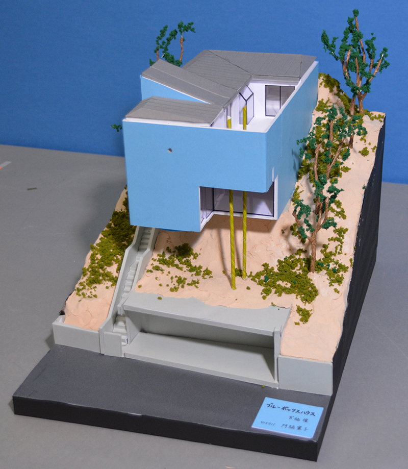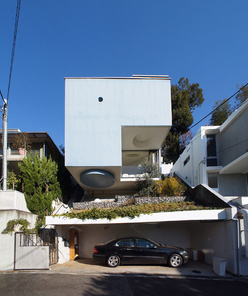 Ở một trường hợp khác, con dốc nằm ở hướng vuông góc với trục đường chính, Blue box của Mayawaki Mayumi – 1971 tận dụng con dốc để làm Gara và cảnh quan cho công trình