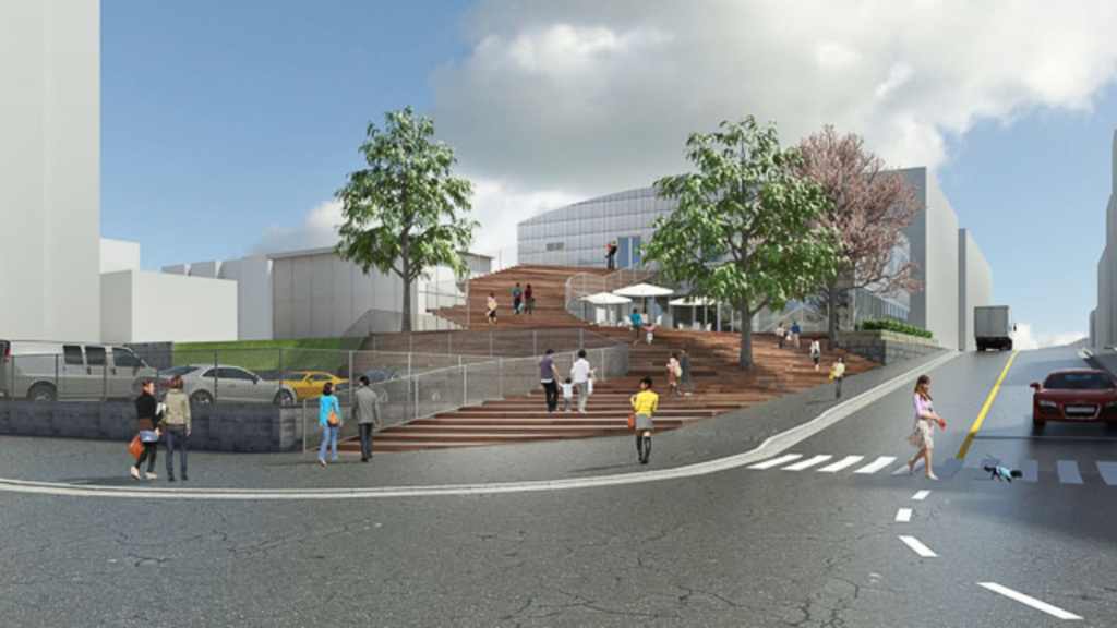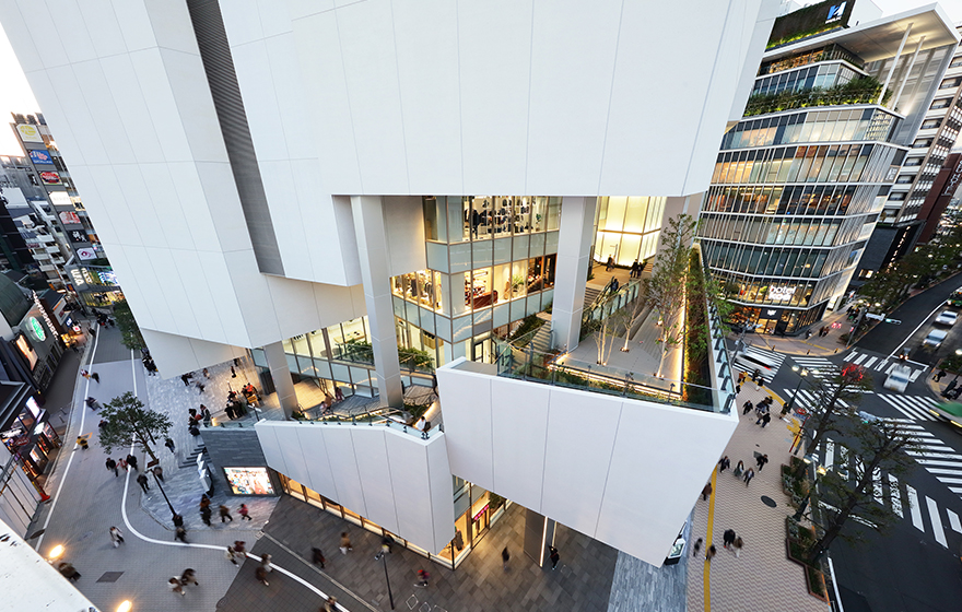 Cầu thang được sử dụng để bao quanh công trình, kết nối các level trên mặt đất, tái hiện địa hình dốc của khu vực Shibuya