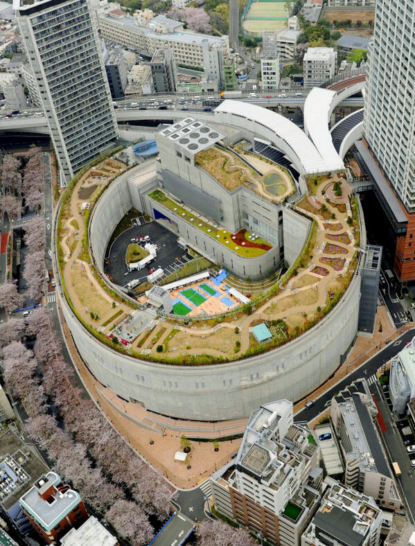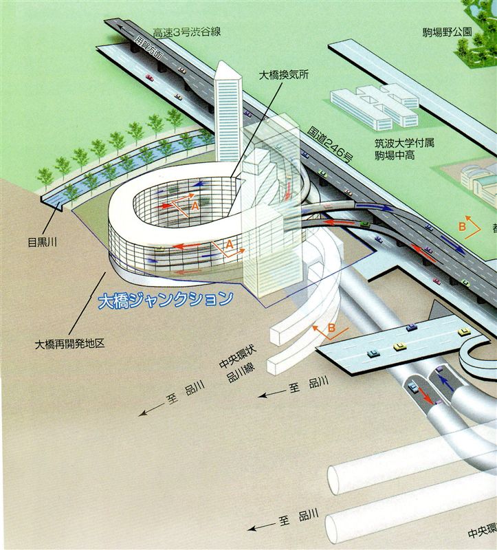 Một “công trình” được xây trùm lên nút vòng xoay nâng cao độ để oto nhập làn vào đường cao tốc tại Meguro Sky Garden