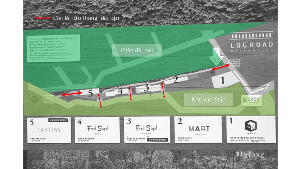 Logroad Daikanyama là một dự án được xây dựng ở giữa lưng chừng một con vực, lối vào bên trên thẳng và phẳng lặng