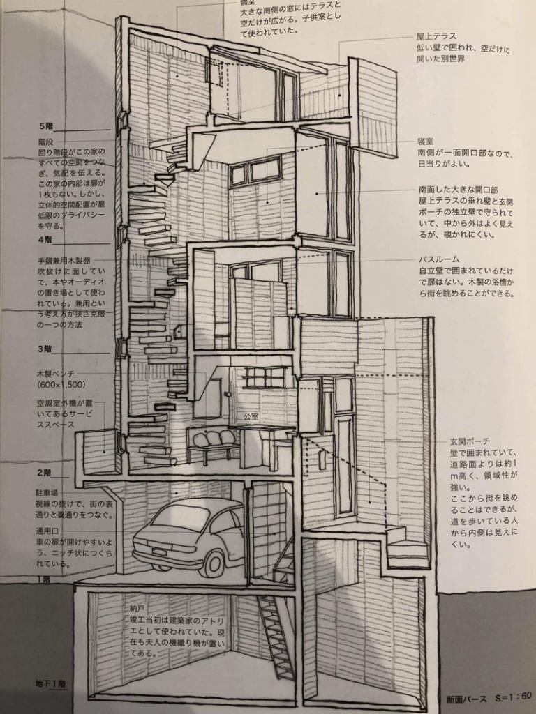 Với những căn phòng không có cửa, và mỗi một bậc chiếu nghỉ là một “căn phòng” – sự riêng tư gần như không tồn tại trong căn nhà này. Tuy vậy nó vẫn được đánh giá là một kiệt tác trong việc tận dụng không gian trong một đô thị chật trội như ở Tokyo.