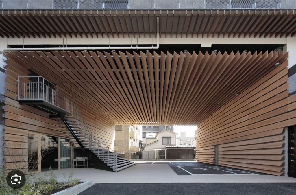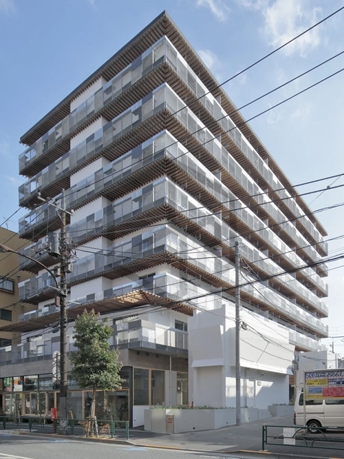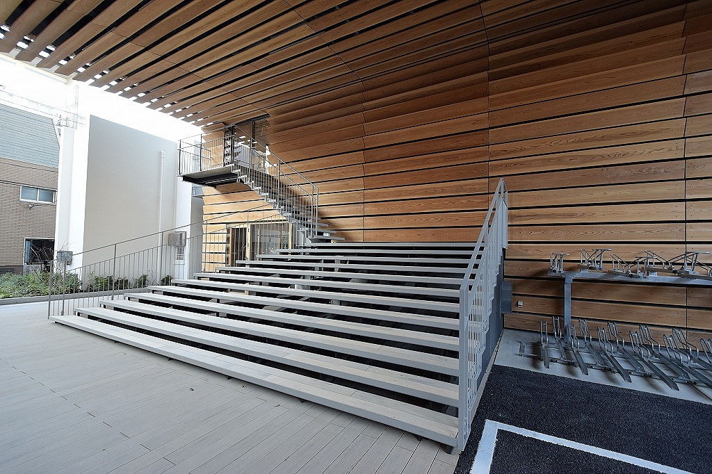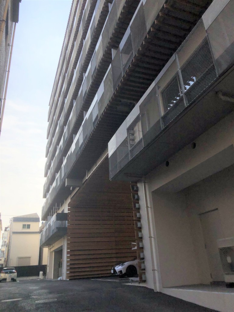 Khi đi bộ từ ga tới, hình ảnh đầu tiên đập vào mắt đó là hệ lam gỗ từ trần ban công. Mặt đứng ban công được cấu tạo từ thép expand và các bề mặt kim loại sắp xếp lại, tạo nên hình ảnh mặt đứng khá khác biệt.