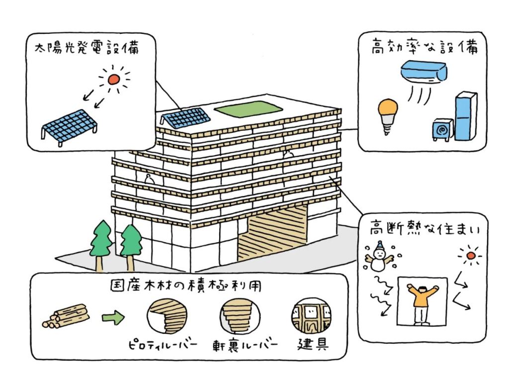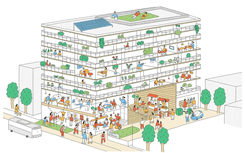 Từ tầng 3 trở lên là khu nhà ở, sân thượng thì được phủ bởi các tấm pin mặt trời và chừa một chút không gian thư giãn cho cư dân