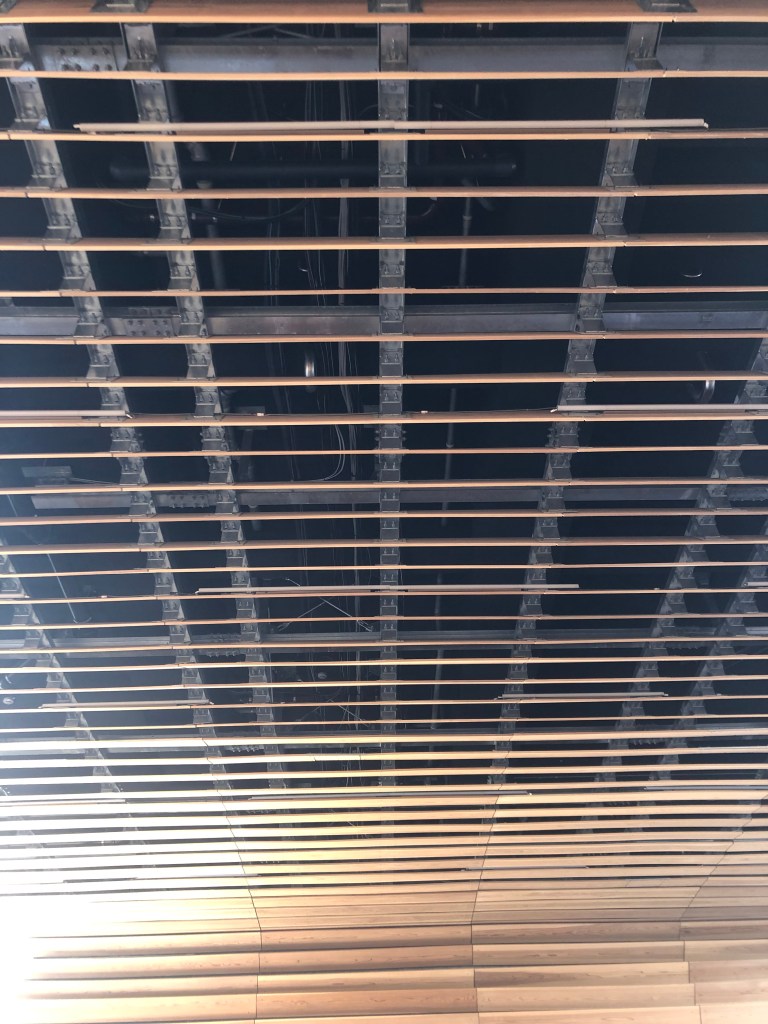 Nhìn từ trên xuống, hệ lam gỗ ở tầng 2 kết nối với hệ khung thép, hầu như không có tác dụng che nắng che mưa, cũng không phải yếu tố quá cần với ngoại cảnh kiến trúc, nên đối với người viết thì đây chỉ đơn thuần là sự vui chơi hơi quá đà của người thiết kế.