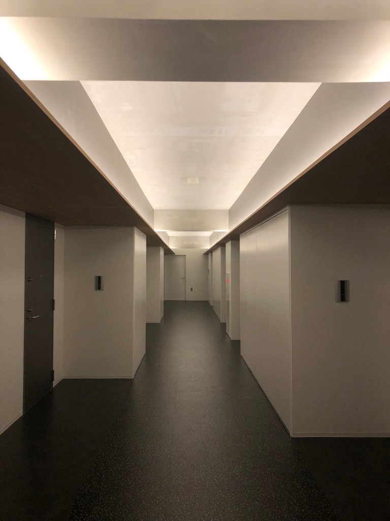 Không gian hành lang bên trong dẫn đến các căn hộ với trần giật cấp, đèn âm trần, tường trắng và sàn tối màu, một xu hướng trong thiết kế gần đây là tạo các hõm tường (niche) để giảm bớt sự đột ngột giữa các căn hộ và làm cho không gian lối vào trở nên sang hơn.